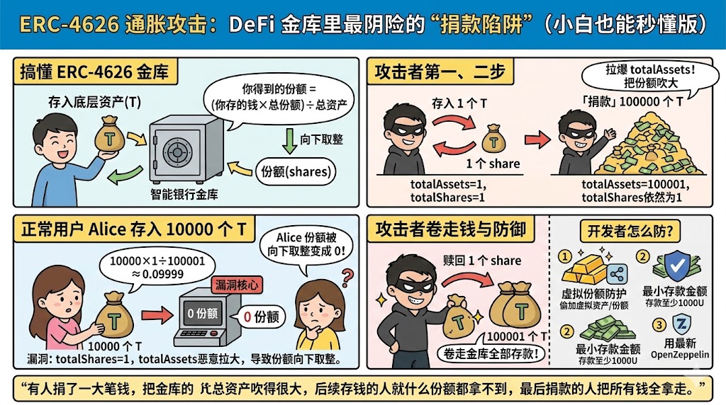 2023年,某 DeFi 金库刚上线,攻击者只花了1块钱,就把整个金库的钱全卷走了。这不是科幻,这就是 ERC-4626 金库的"捐款陷阱"——通胀攻击(Inflation Attack)。