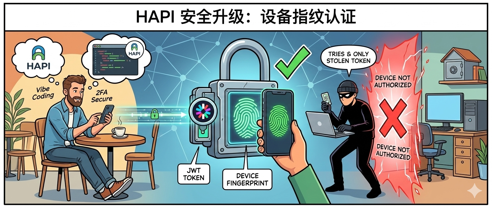 最近在用 HAPI 这个去中心化 AI 代理平台,体验了"Vibe Coding"的自由感——在咖啡馆、徒步时也能远程控制本地开发环境。但在实际使用中发现了安全隐患:原生的 JWT Token 认证在多设备场景下缺少设备级管控。于是我 fork 了项目,新增了设备指纹认证功能,实现"设备 + Token"的双因素验证。